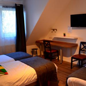 Zimmer für 3 Personen mit zwei Einzelbetten und einem kleinen Bett.